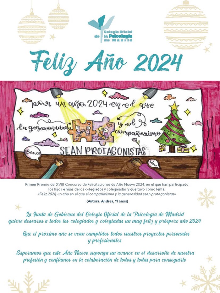 ComunicaciónEl Colegio Oficial de la Psicología de Madrid desea un Feliz Año 2024 a Todos los Colegiados Y Colegiadas
